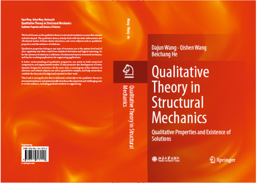 近日,由北京大学王大钧教授领衔,我院王其申教授参著,美国通用电气公司何北昌高工主译的英文专著《Qualitative Theory in Structural Mechanics》已由Springer出版社和北京大学出版社联合正式出版。这次出版的英文版,是本书三位作者在2014年北京大学出版社出版的中外物理学精品书系之一的《结构力学中的定性理论》一书基础上,精心修改的产物。新书采用严格的数学推理和结构力学的基本概念相融合的方法,论述了线弹性结构力学中三个领域内的定性理论,内容包括:⑴一维典型结构弦、杆和梁的离散和连续系统的固有频率和模态的定性性质;⑵重复性结构的离散和连续系统的固有频率和模态的定性性质;⑶弹性结构振动的普遍性质。全书共八章,王其申教授起草了其中的第二至第六章。该书的出版在结构力学中的定性理论研究领域为国内外有关同行提供了一本具有理论意义和实用价值的学术参考资料。