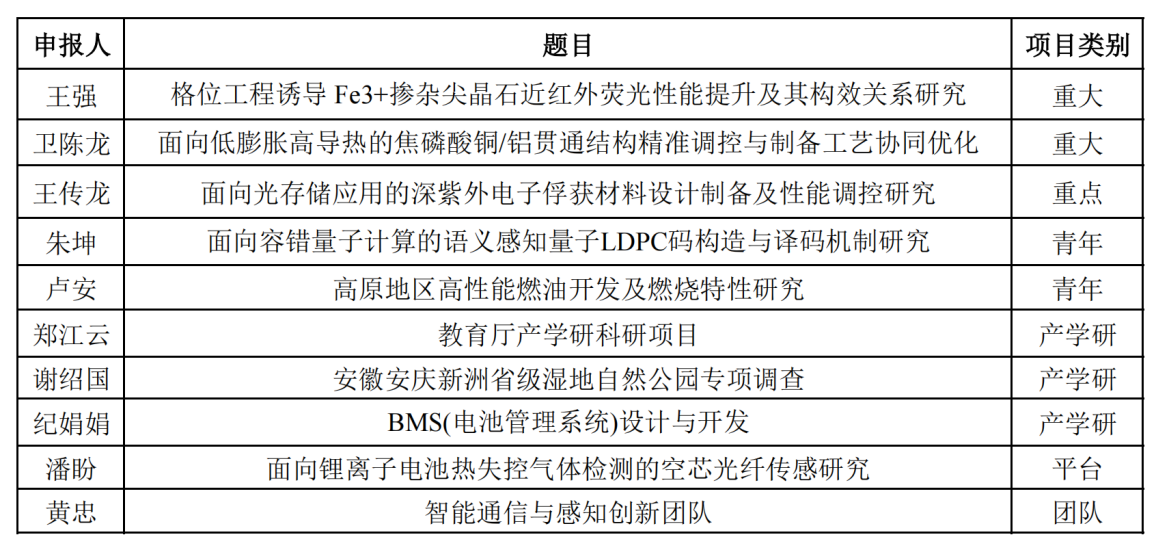 根据《安徽省教育厅关于开展2025年度科研项目申报工作的通知》(皖教秘科【2025】116号)精神,电子工程与智能制造学院学术委员会于2025年12月5日召开推荐评审会,对本次申报的项目开展审核与评议。经专家组评审推荐、学院党委会研究、党政联席会决定通过。现予以公示。推荐排序名单如下:
